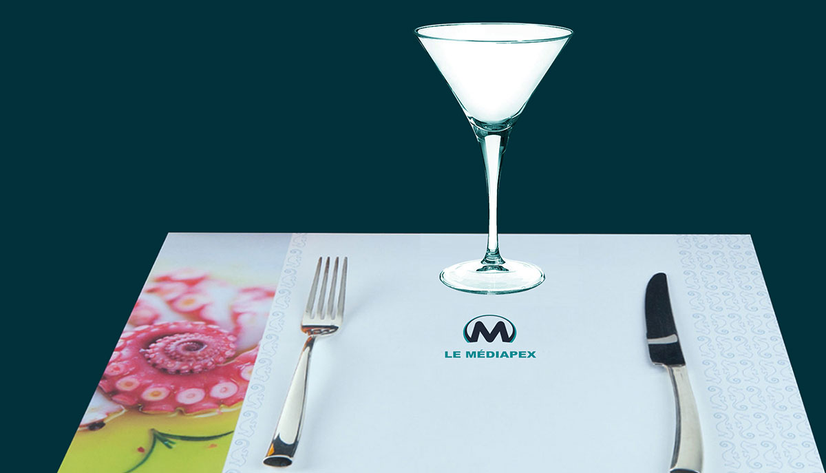 Médiapex vous propose des sets de tables personnalisés qui non seulement vont vous permettre de mettre en avant les produits souhaités mais aussi avoir un support de communication avec une double efficacité : carte de menu et nappe.